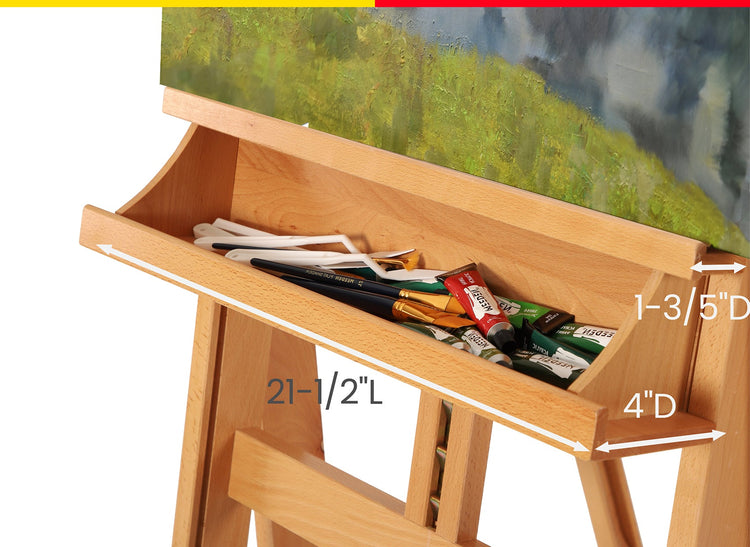 The large storage tray provides ample room to keep your brushes, paints, and tools organized and with in reach while working. The thicker upper tray supports larger, heavier canvases.