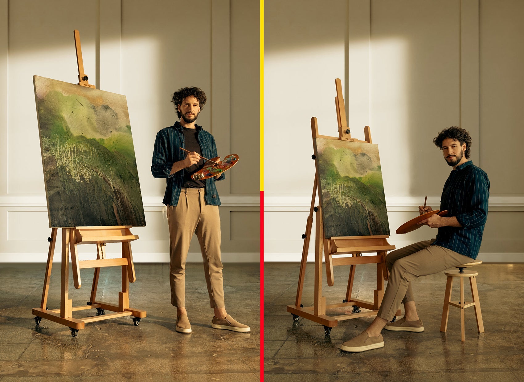 Crafted from hand-sanded German beech wood, this elegant MEEDEN easel supports up to 66 lbs. Versatile for various mediums, it adjusts horizontally for watercolor and paint pouring, or tilts for pastel, acrylic, oil, and gouache.