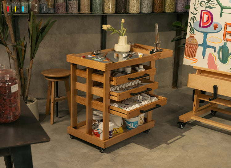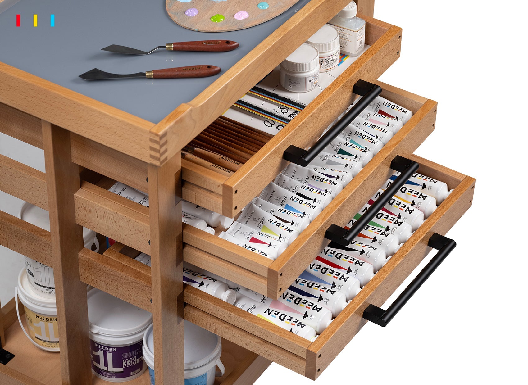 The three-tiered drawers are designed for effortless access, with smooth glides that make reaching your art supplies a breeze. Their spacious compartments provide ample room to store and organize your materials, ensuring a clutter-free workspace and enhancing your creative efficiency.