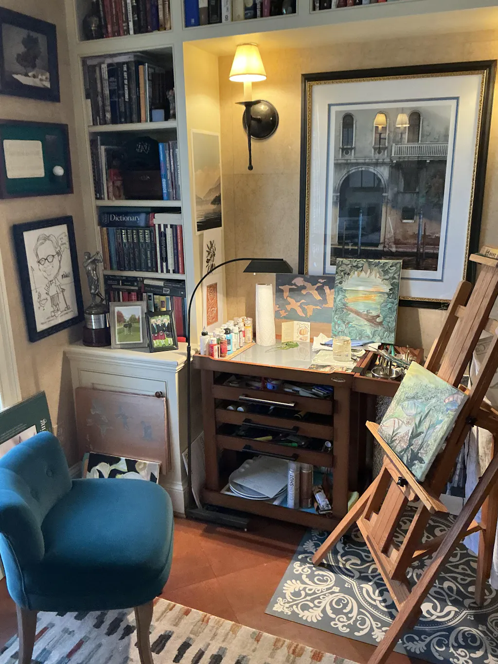 Combining vintage charm with industrial sophistication, the mahogany storage cart effortlessly integrates into any room, elevating the artistic ambiance with a touch of refined elegance.
