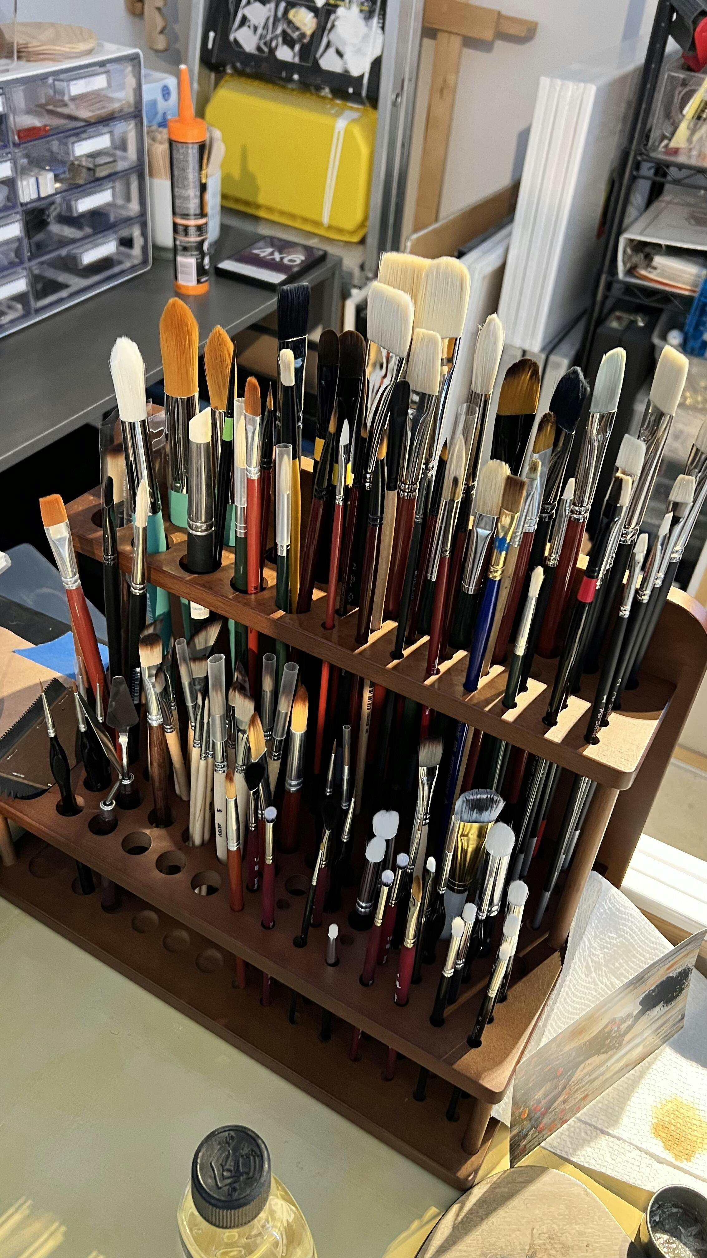 - Multi-Functional Design: This brush storage rack boasts a simple yet practical design with a well-organized layout, accommodating multiple brushes and providing easy access. It is also suitable for holding stationery, makeup brushes, and other items, keeping your workspace tidy and organized. Whether you're a professional artist or an office worker, this versatile storage rack enhances your workspace efficiency.